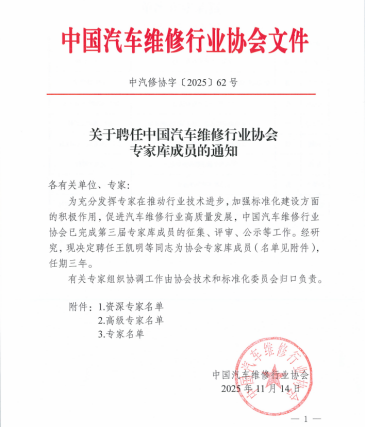 2025年11月14日,中国汽车维修行业协会正式发布《关于聘任中国汽车维修行业协会专家库成员的通知》(中汽修协字〔2025〕62号),绵阳飞行职业学院汽车专业带头人向平老师经过全国范围的征集、严格的评审与公示程序,成功受聘为协会第三届专家库高级专家,聘期三年。