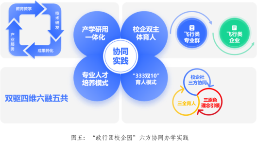 2.“双驱四维六融五共”专业人才培养模式创新。在飞行类重点专业群实践该模式——以产教融合实体化与专业协同场景化为“双驱”,企业投入实训设备,校方转化企业场景为教学现场,共建跨专业训练体系,提升协作效率;构建四维矩阵,提升毕业生跨岗作业能力;通过“六融”路径与“五共”机制,有效提升学生职业能力,为航空类专业育人提供新范式。
