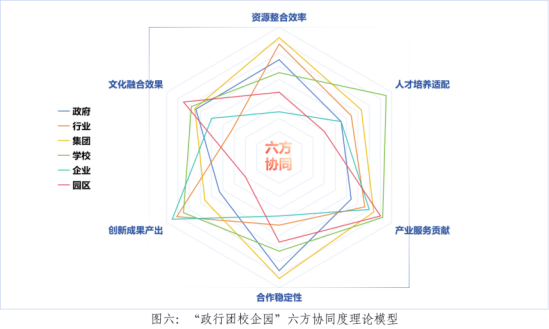 2.架构“六方协同度”理论模型”。基于理论应用和实证研究,从资源整合效率、人才培养适配性、产业服务贡献度、合作稳定性、创新成果产出、文化融合效果六个维度架构“六方协同度”理论模型,为动态优化协同机制、提高资源利用效率提供科学依据。